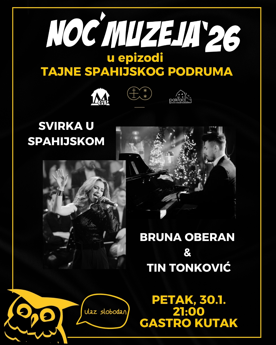 U sklopu Noći muzeja, od 21:00 sat u Gastro kutku Spahijskog podruma očekuje vas ugodna glazbena večer uz Brunu Oberan i Tina Tonkovića.