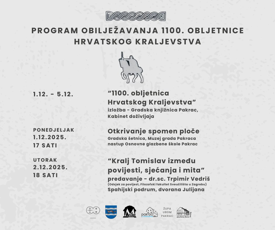 Grad Pakrac, Gradska knjižnica Pakrac i Muzej grada Pakraca, uz podršku Osnovne glazbene škole Pakrac i Župe Uznesenja BDM Pakrac, s ponosom vas pozivaju na obilježavanje 1100. obljetnice Hrvatskog Kraljevstva — velikog jubileja koji nas podsjeća na začetke hrvatske državnosti, identiteta i zajedništva.